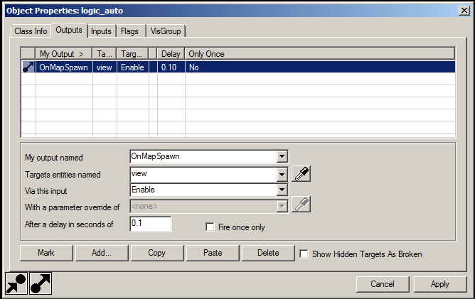 Edit logic_auto, add output "OnMapSpawn" "view,Enable,,0.1,-1"