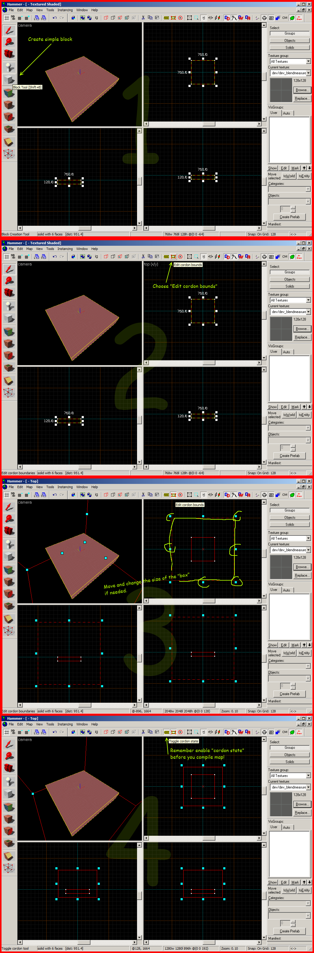 Make a simple scene of experimental purpose. Practice to use the Hammer Cordon Tool, this allows you to skip the sky box making (Development purposes). Example picture From here on, use these parameters when you compile the map.