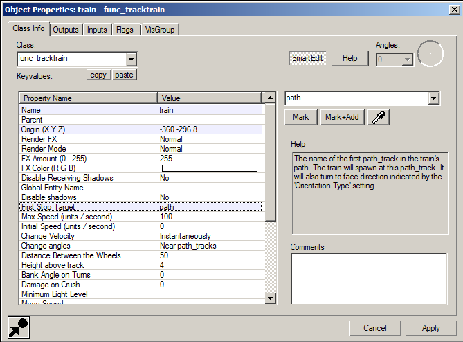 - Create small brush, change it to entity func_tracktrain, name it "train"