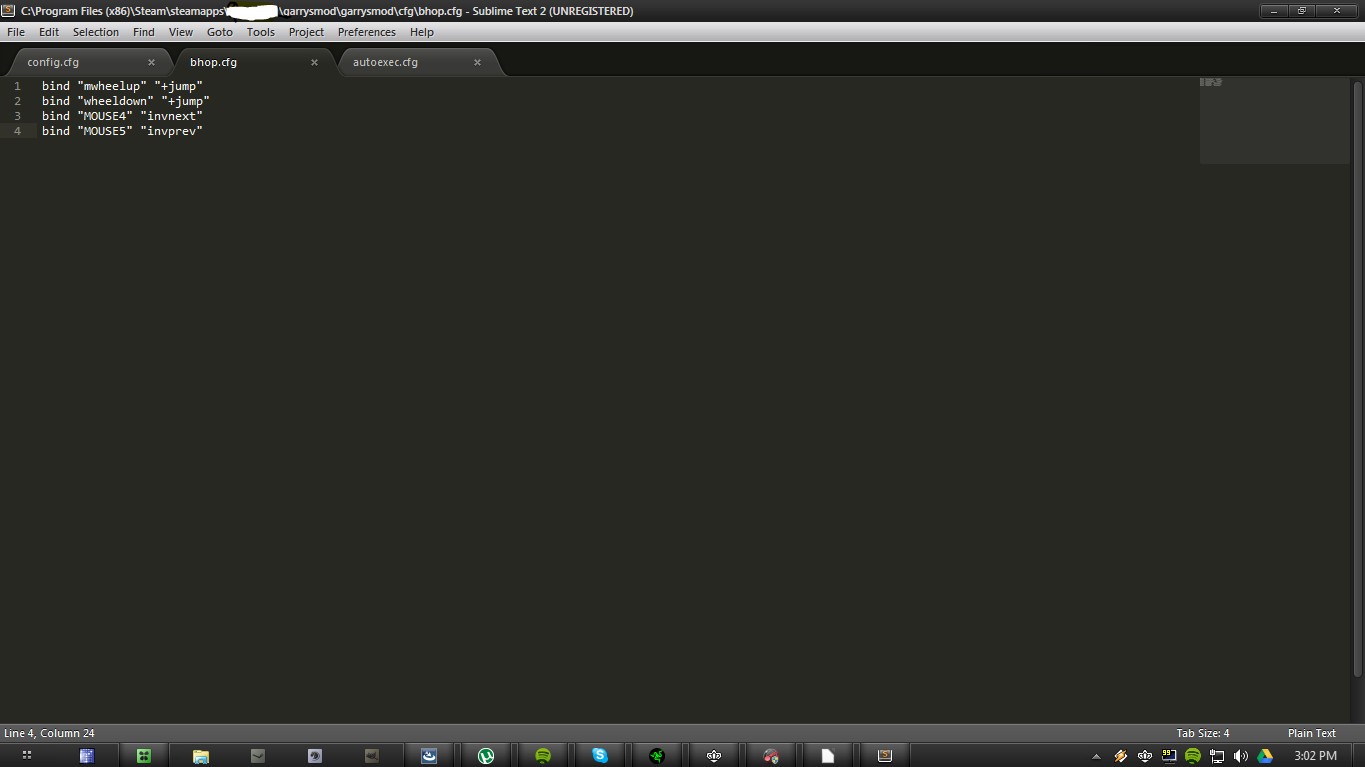 how to bind keys (note: wait command is disabled in gmod and maybe others) Notes: Gmod might reset these settings sometimes so i advise you to make a script in garrysmod/garrysmod/cfg and exec it when and if it resets.