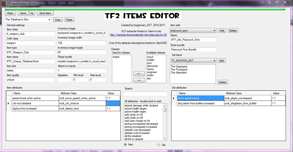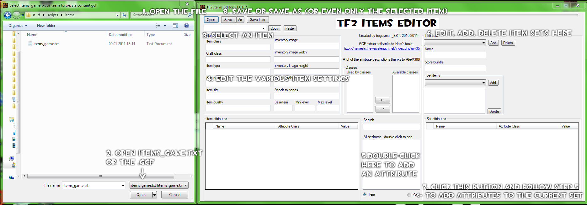 This program allows you to open up items_game.txt, (or extract it from the .gcf) which contains all the items' custom attributes and other settings, and edit them in an easy-to-use interface.