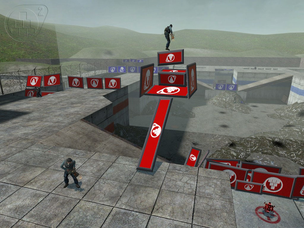 SourceForts is a Half Life 2: Deathmatch mod where Combine and Rebels face off in capture-the-flag action with a big twist. Players build bases and other structures with blocks and plates in the "build phase" to protect themselves and their team's flag (which is actually a ball), and then fight it out and try to capture the enemy's flag in the "combat phase". Once the combat phase has ended, it's back to build, where players can repair, improve, and change their creations to ready them for the next combat phase.