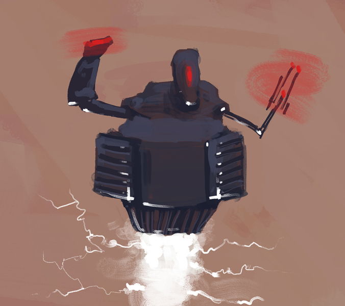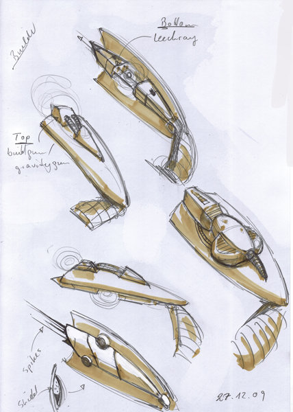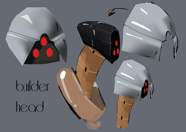 the next months I worked on the scout, the tank, the reclaimer ... but I had no idea for the builder. Then I made a concepts of flying robots and hovering ones. Flying would have resulted in gameplayissues but hovering was OK. So I‘ve drawn those quick sketches: