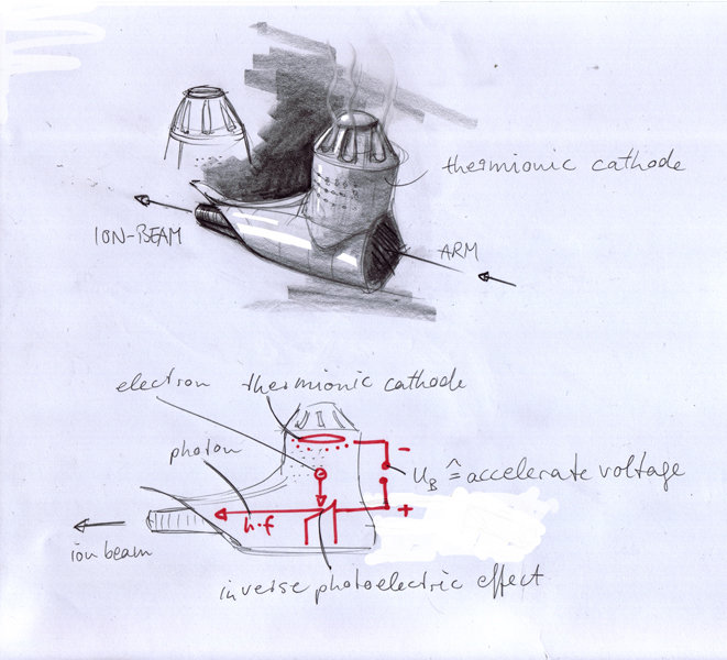 with a strong beam of photons the object you are pointing at will ionize. so its charged. above the arena is a magnet which will make the object hover.