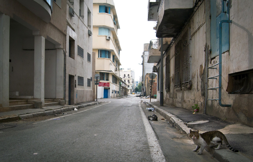 6 - A cat crosses an empty street on January 16, 2011 in the center of Tunis. Dozens of people crowded on Sunday at the few stalls open at the main market in Tunis as soldiers patrolled the streets but spirits were high after the overthrow of strongman Zine El Abidine Ben Ali. "Our children will live in a free country," said Mouna Ouerghi, 29, a university lecturer who was queuing for bread. "The situation is getting better," she said. "A lot of shops are open today. We believe in our people." (MARTIN BUREAU/AFP/Getty Images)