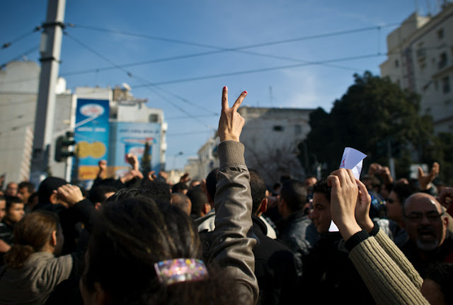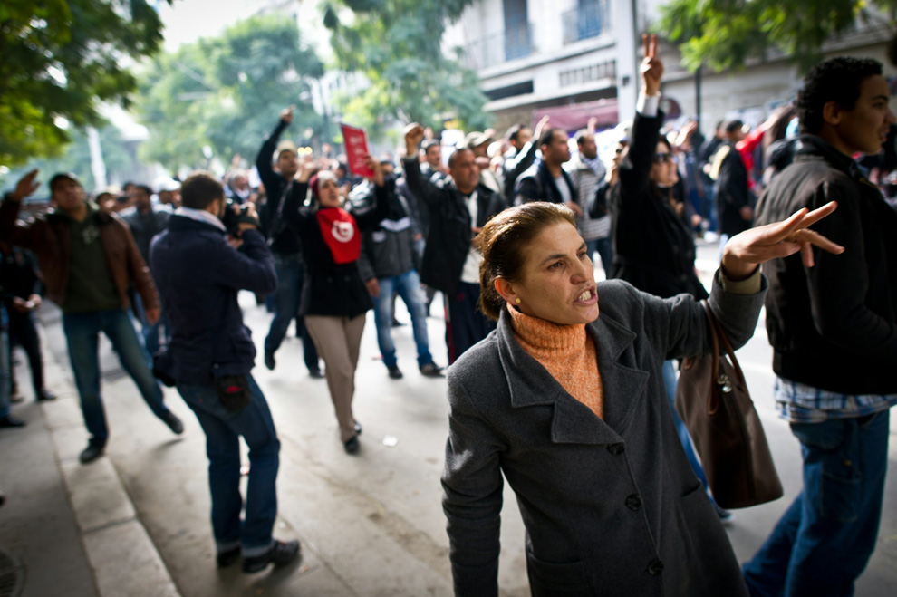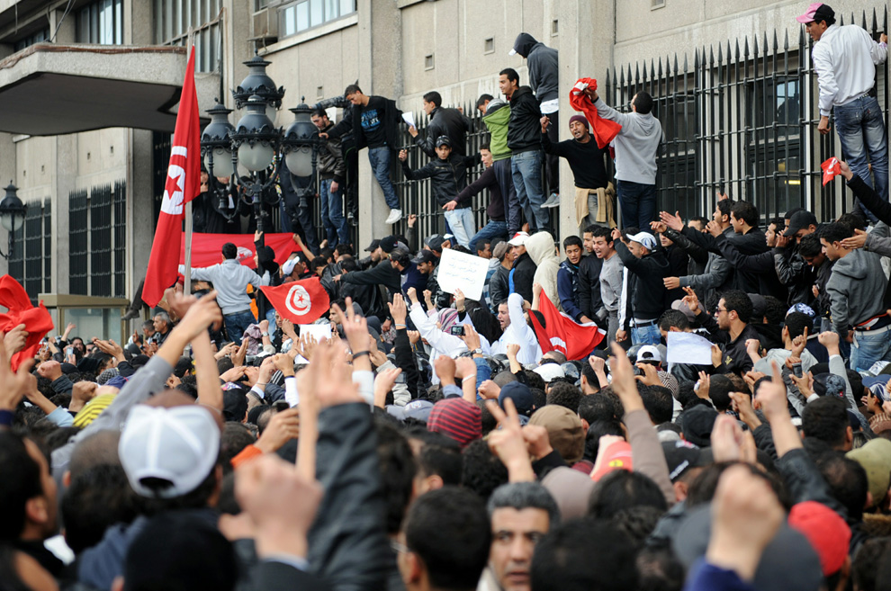 1- People demonstrate during a protest in central Tunis on January 17, 2011. After weeks of demonstrations, Tunisian protesters called for the abolition of ousted president Zine El Abidine Ben Ali's ruling party on January 17 amid a chaotic power vacuum as politicians prepared a government of national unity. Hundreds of people rallied in Tunis and there were similar protests in Sidi Bouzid and Regueb in central Tunisia -- two towns at the heart of the movement that forced Ben Ali to resign and flee on Friday after 23 years in power. (MARTIN BUREAU/AFP/Getty Images)