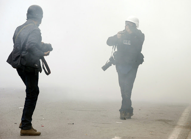 17- Press photographers walk through clouds of tear gas during demonstrations in Tunis on January 18, 2011. (FETHI BELAID/AFP/Getty Images)