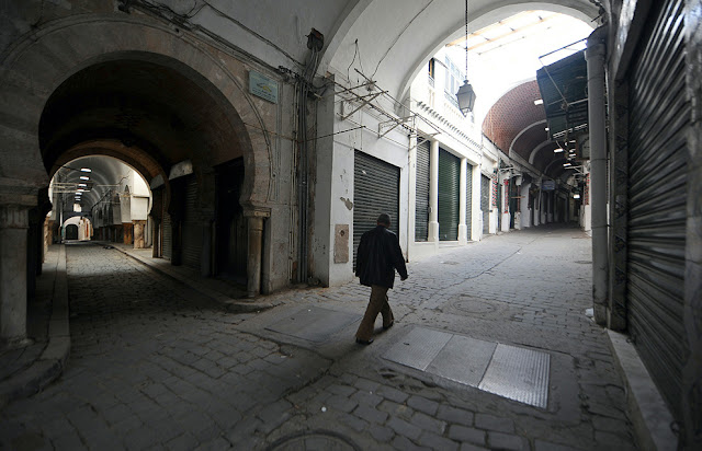 19- A man walks past closed tourist shops in Tunis' souk on January 16, 2011. Dozens of people crowded on Sunday at the few stalls open at the main market in Tunis as soldiers patrolled the streets but spirits were high after the overthrow of strongman Zine El Abidine Ben Ali. (FETHI BELAID/AFP/Getty Images)