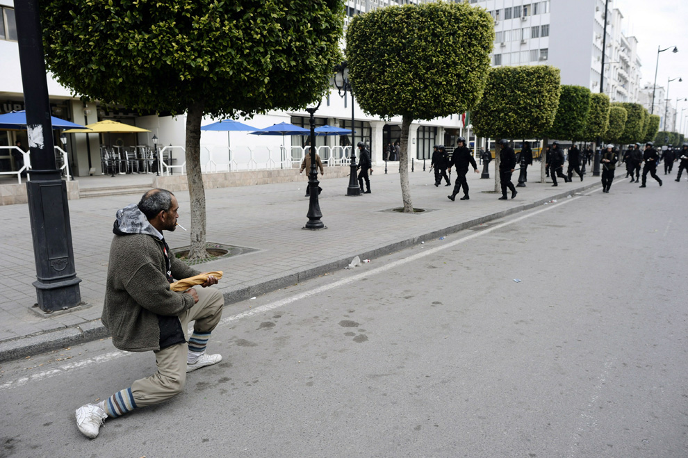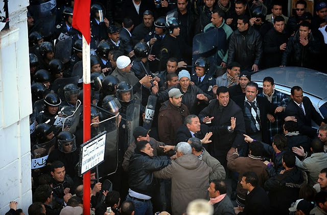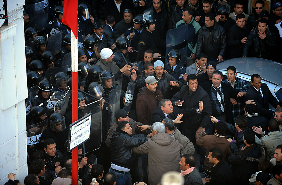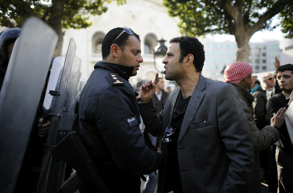 8- A demonstrator argues with a policeman during a protest in the center of Tunis on January 17, 2011. Hundreds of people rallied in central Tunis on Monday to demand the abolition of ousted president Zine El Abidine Ben Ali's ruling RDC party as police fired volleys of tear gas to break up the protest. "We don't want anyone from the old party in the new government. That includes the prime minister," one protester told AFP on condition of anonymity. (FRED DUFOUR/AFP/Getty Images)