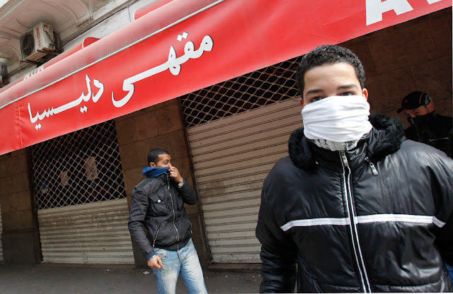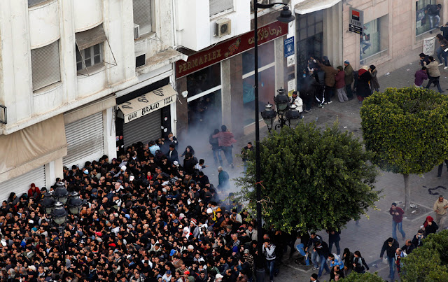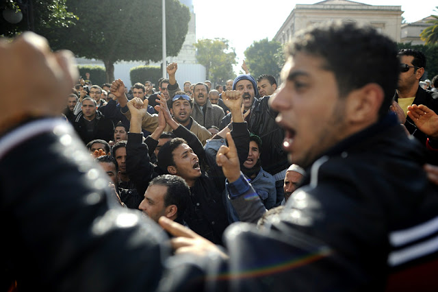23- A demonstration is held against the country's new government in Tunis on January 18, 2011. (MARTIN BUREAU/AFP/Getty Images)