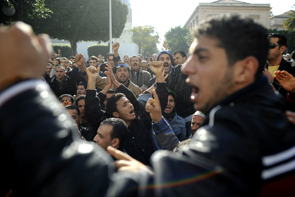 22- Protesters shout slogans during a demonstration against Tunisia's new government in Tunis on January 18, 2011. (MARTIN BUREAU/AFP/Getty Images)