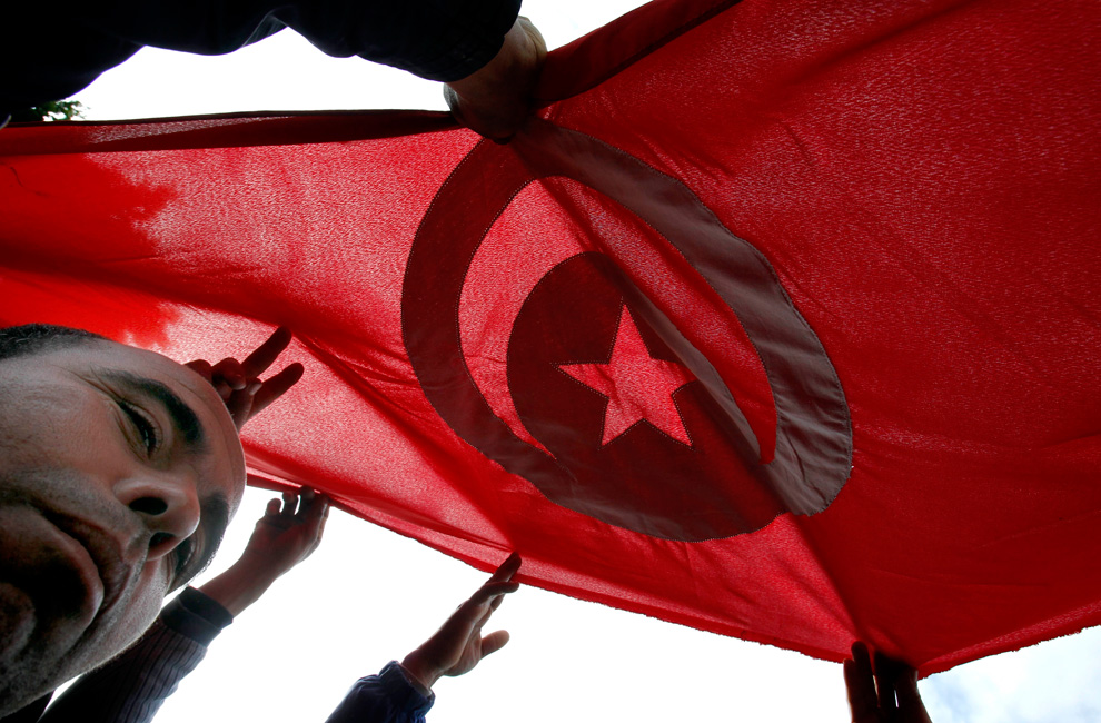 40- Protesters hold a Tunisian Flag during a demonstration in the center of Tunis, Wednesday, Jan. 19. 2011. Protesters sang nationalist songs and held up signs with "RCD Out!", referring to Ben Ali's former ruling party, as they rallied on central Avenue Bourguiba. (AP Photo/Christophe Ena)