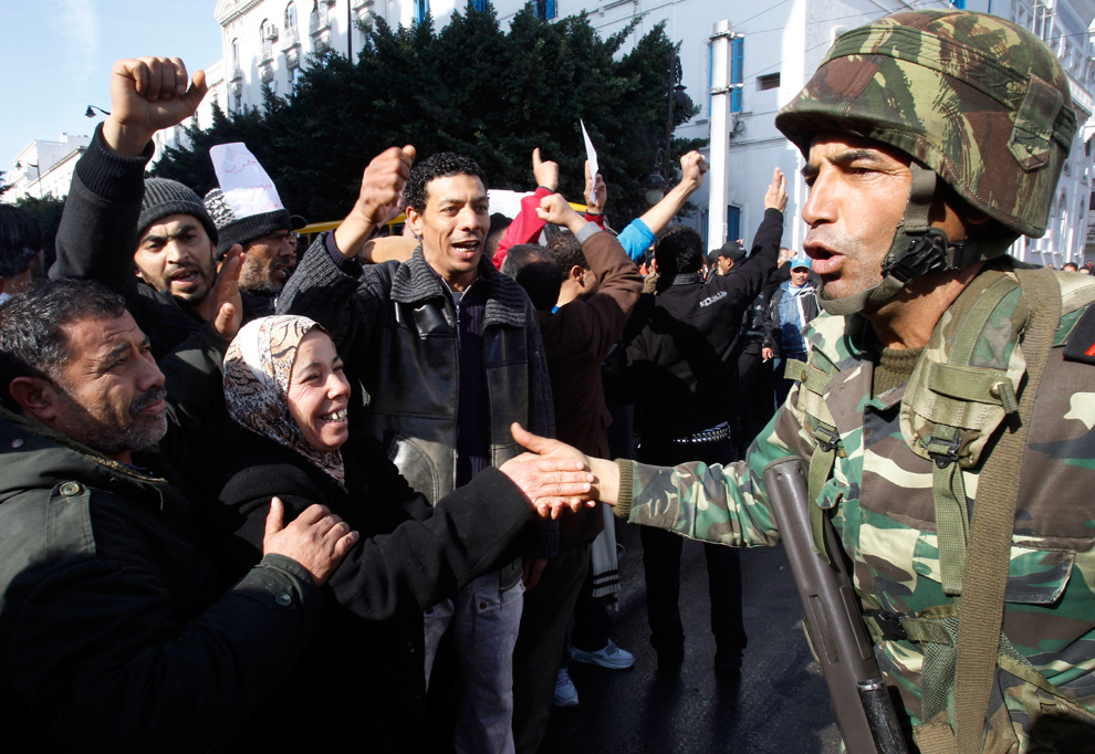 10- Protesters greet soldiers during a demonstration against former Tunisian President Zine El Abidine Ben Ali in the center of Tunis, Monday, Jan. 17. 2011. (AP Photo/Christophe Ena)