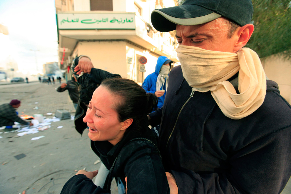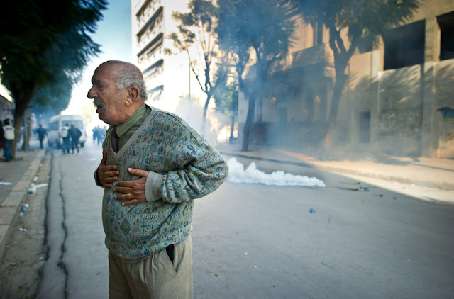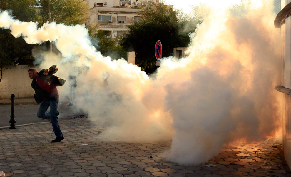 14- A man struggles to breath e as a teargas canister fired by police lies in the road during demonstrations in Tunis on January 17, 2011. (MARTIN BUREAU/AFP/Getty Images)