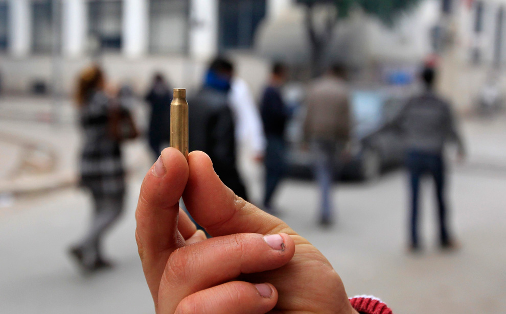 26- A protester shows an empty bullet casing after riot police broke up a demonstration in downtown Tunis January 18, 2011. (REUTERS/Zohra Bensemra)