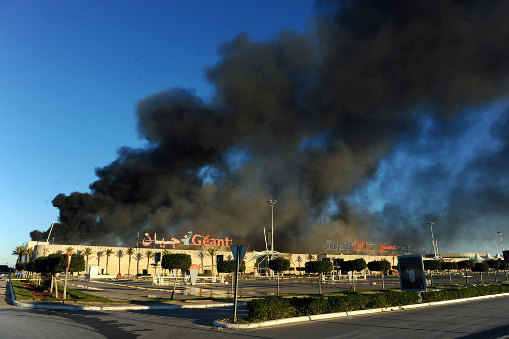 32- Smoke billows from a French and a Tunisian supermarket on January 15, 2011 in La Gazella city near Tunis. (FETHI BELAID/AFP/Getty Images)