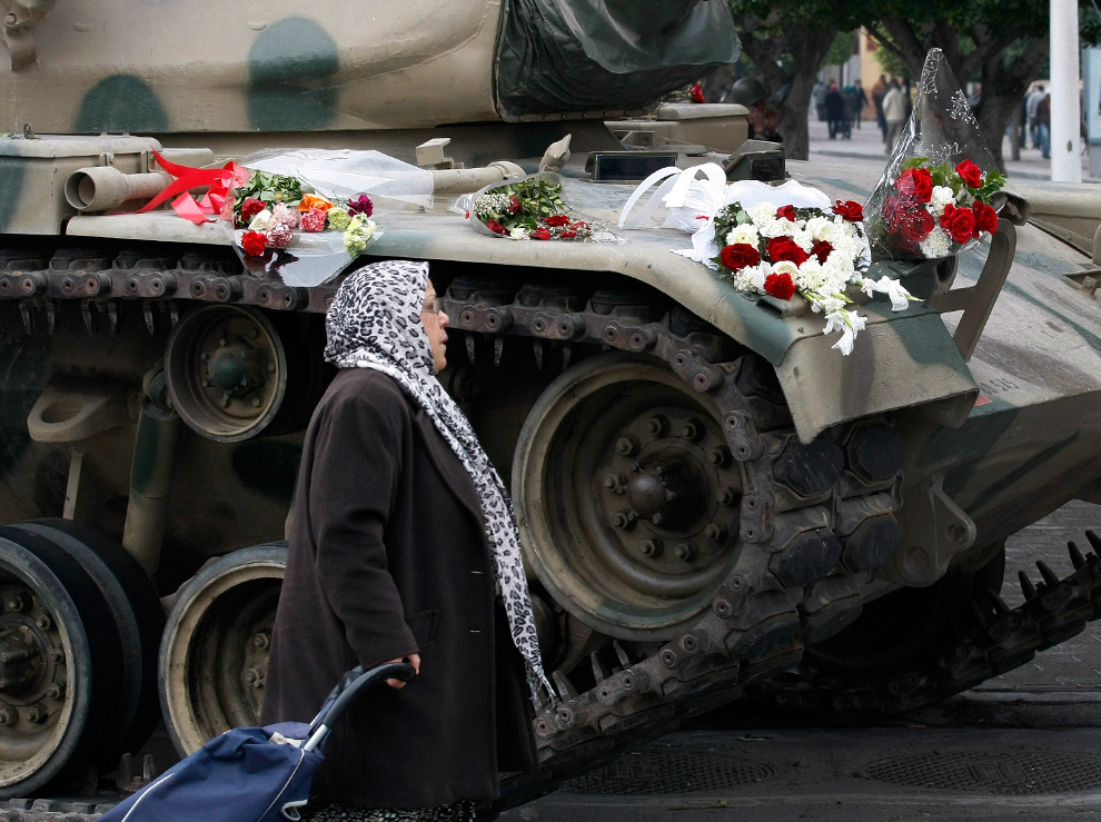 39- A woman walks past a tank as flowers are displayed on it in the center of Tunis, Tuesday, Jan. 18, 2011. (AP Photo/Christophe Ena)