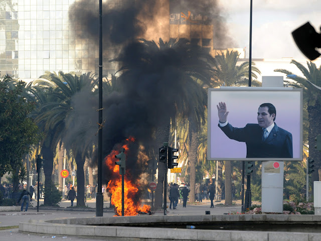 4 - Smoke rises from fire left after clashes between security forces and demonstrators in Tunis on January 14, 2011 after Tunisian President Zine El Abidine Ben Ali's address to the nation. Tunisian President Zine El Abidine Ben Ali had sacked the government and called early elections in six months, the prime minister announced as weeks of deadly unrest mounted with new clashes. (FETHI BELAID/AFP/Getty Images)