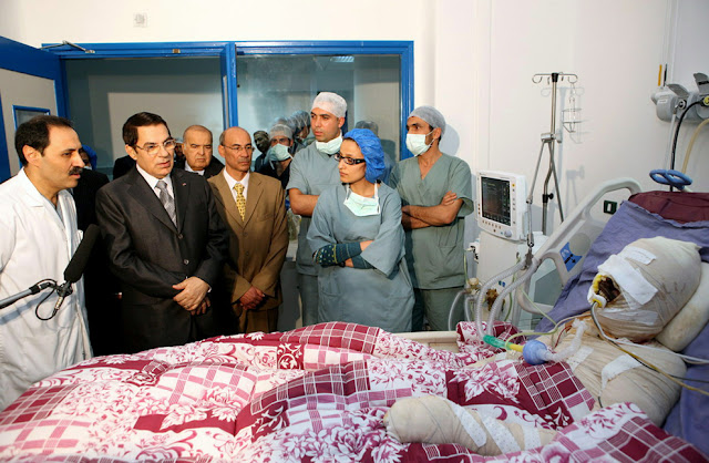 2- A handout picture released by the Tunisian Presidency shows Tunisian president Zine El-Abidine Ben Ali (2nd from left) looking at Mohamed Al Bouazzizi (right), during his visit at the hospital in Ben Arous near Tunis on December 28, 2010. Mohamed Al Bouazzizi, a 26-year-old university graduate, who was forced to sell fruit and vegetables on the streets, doused himself in petrol and set himself alight on December 17, which left him in a serious condition with severe burns. Days of rioting in Tunisia by mostly jobless and frustrated young people protesting violently against the government has exposed the crippling unemployment problem in the north African country. (TUNISIA PRESIDENCY/AFP/Getty Images)