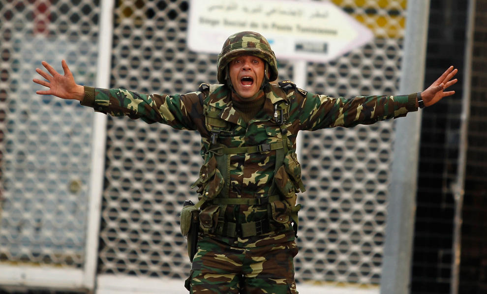 9 - A Tunisian soldier screams as he tries to calm down rioters during clashes with the police in downtown of the capital Tunis January 14, 2011. (REUTERS/Zohra Bensemra)