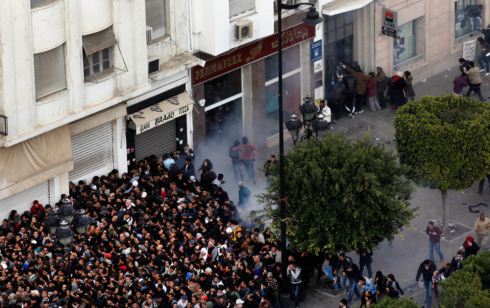 37- People shout as they demonstrate in the center of Tunis on January 17, 2011. Hundreds of people rallied in central Tunis on Monday to demand the abolition of ousted president Zine El Abidine Ben Ali's ruling RDC party as police fired volleys of tear gas to break up the protest. (FRED DUFOUR/AFP/Getty Images)