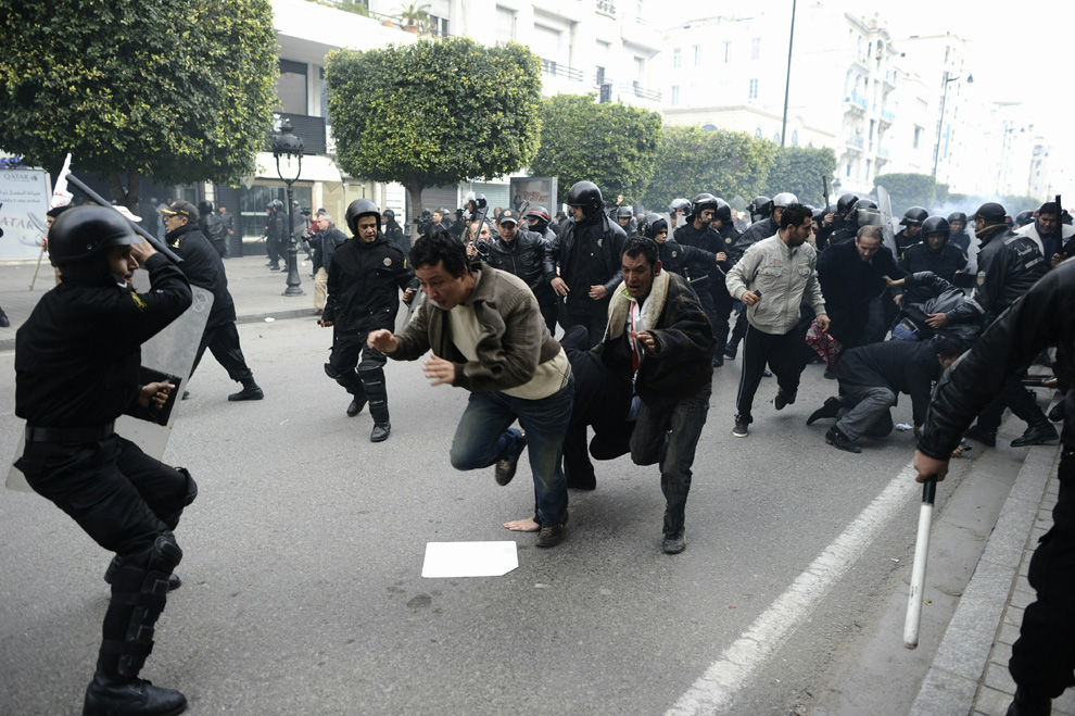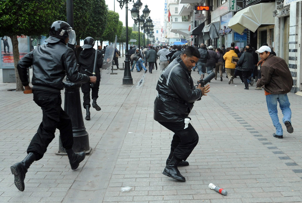 15- Police disperse demonstrators in Tunis on January 18, 2011. (FRED DUFOUR/AFP/Getty Images)