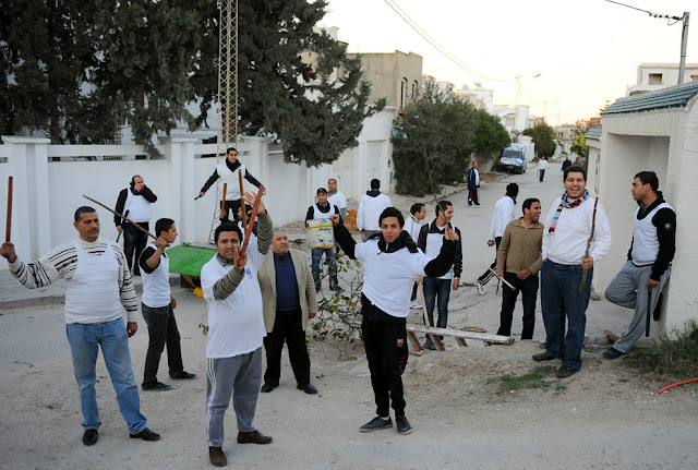 20- Tunisian men hold sticks as they stand guard by a barricade in La Gazella city near Tunis on January 15, 2011. (FETHI BELAID/AFP/Getty Images)