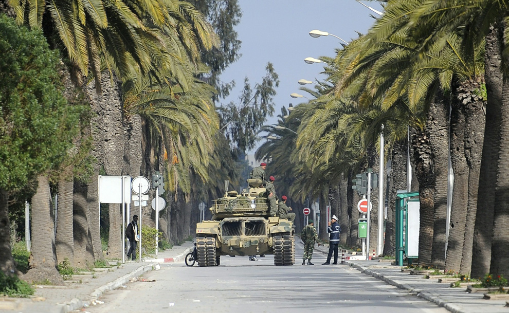 5- Soldiers stand guard near a tank on a street of Tunis on January 16, 2011. Heavy gunfire was heard in the center of Tunisian capital on Sunday with security forces exchanging fire with people inside buildings, AFP journalists said. An army helicopter circled over Avenue Bourguiba near the interior ministry. (FRED DUFOUR/AFP/Getty Images)