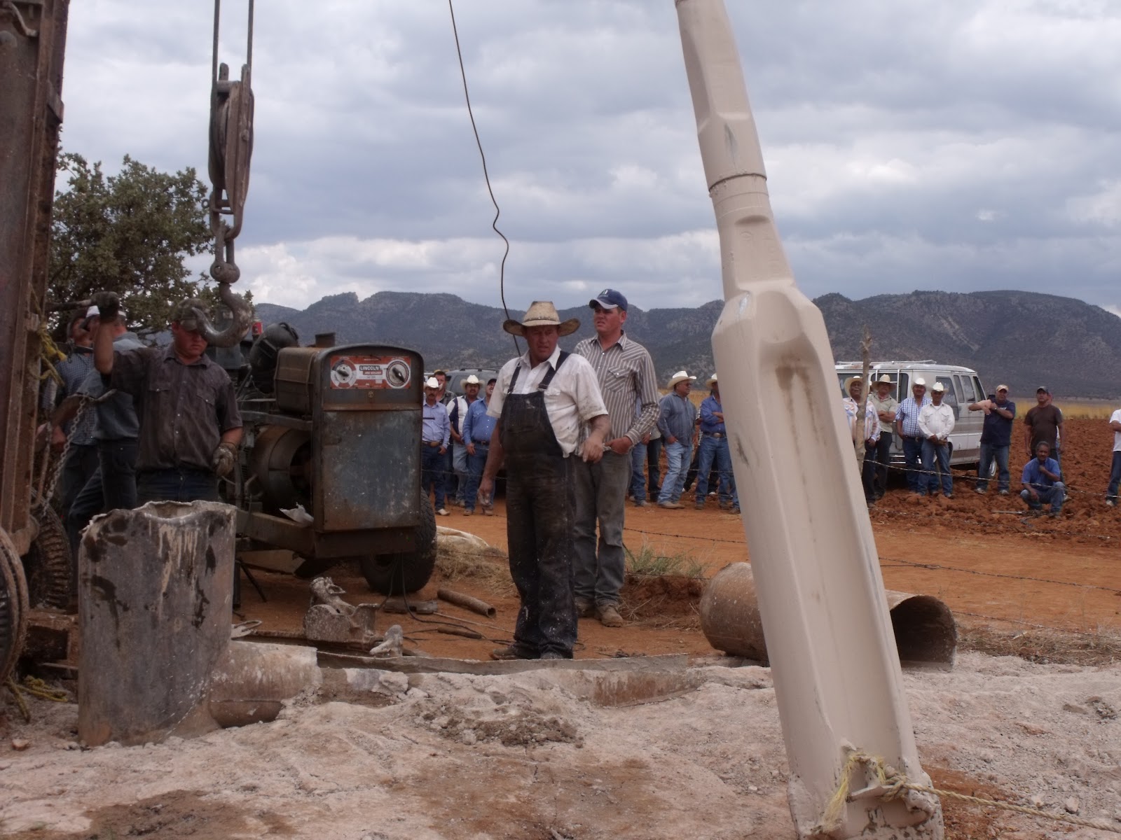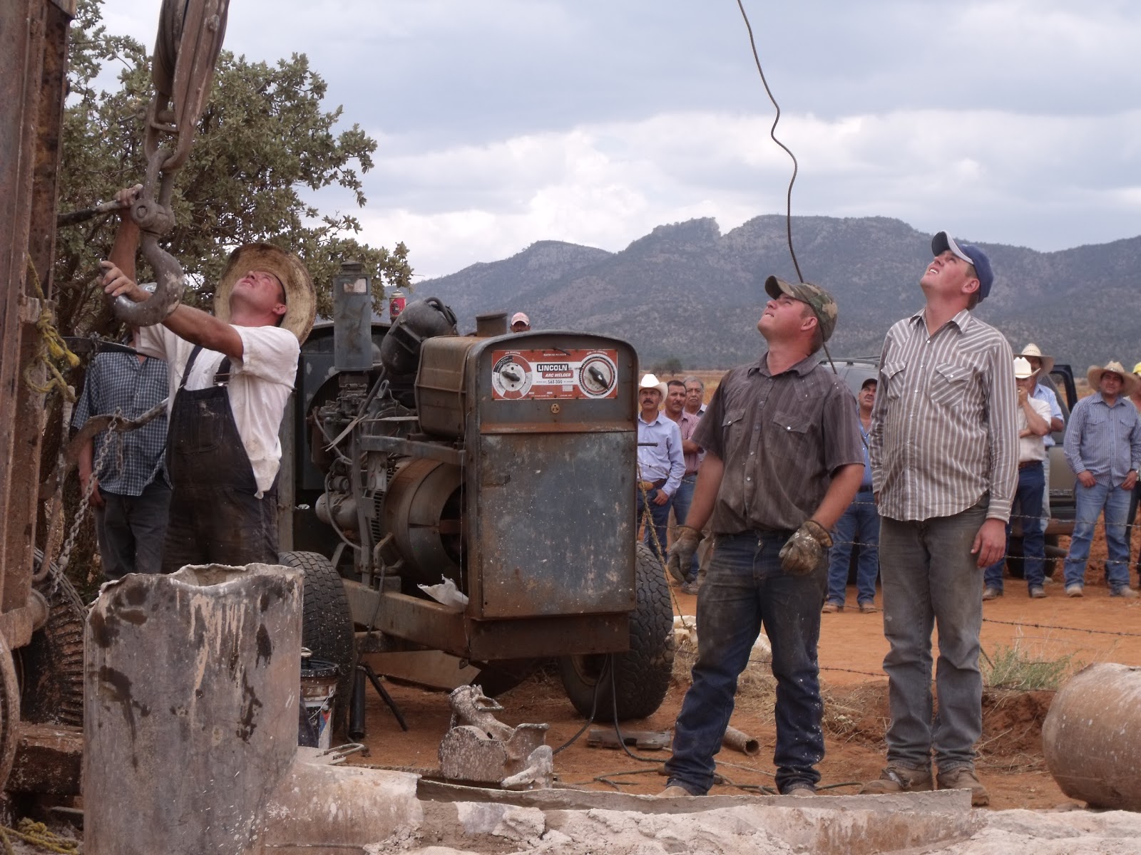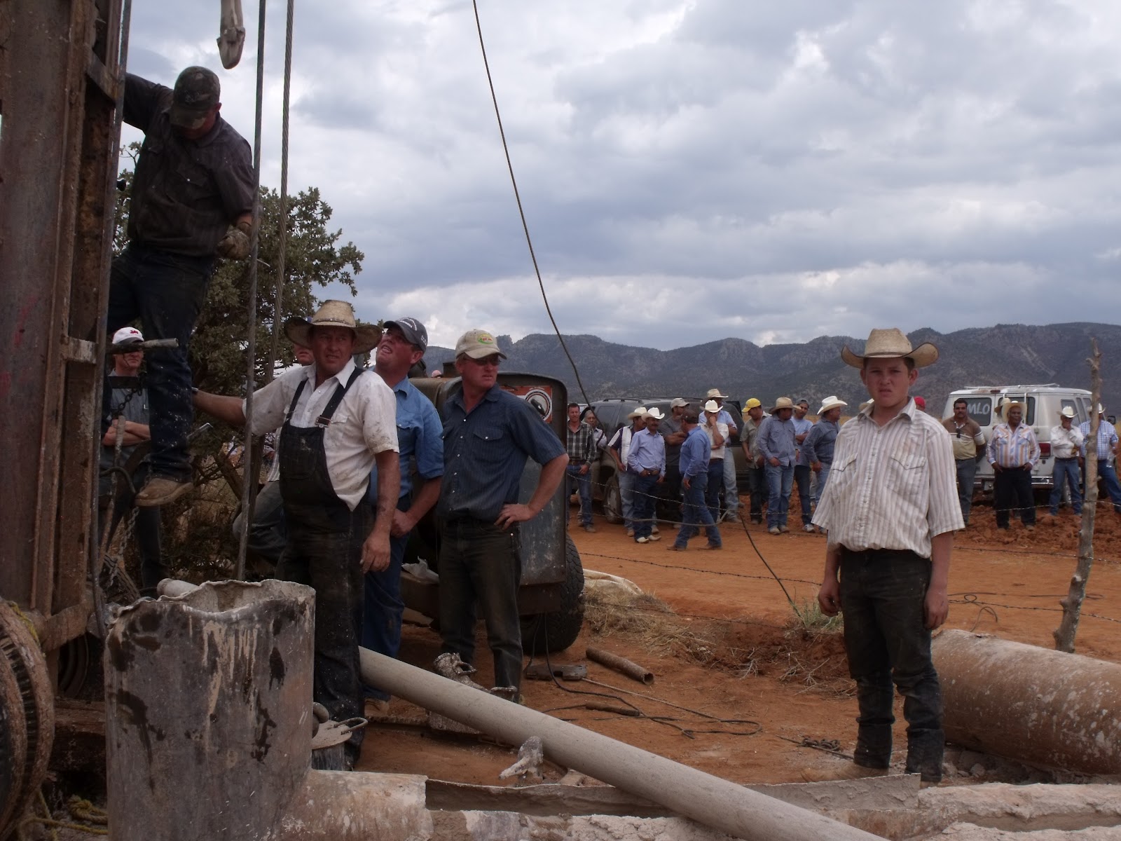Around 1 o’clock the group mobilized and drove in caravan to nearby Mennonite settlement known as Campo 83, where several Mennonite men and a boy were engaged in drilling a new well. Surrounding the rig and the overall-clad Mennonites, the leaders of the local farmers demanded to see the permit for the new well. Since the Mennonite men couldn’t produce a permit or otherwise prove that the well was legal, the non-Mennonite Mexican farmers insisted that the drilling equipment be dismantled – which after some rhetorical wrangling the Mennonite men proceeded to do.