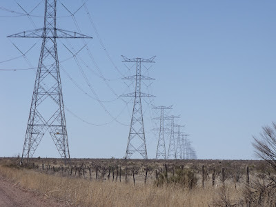 A network of giant transmission towers carrying power lines that crisscross the state explains the miracle of modern agriculture in Chihuahua. Without the electric current these towers carry, the Chihuahuan Desert would not be blooming.