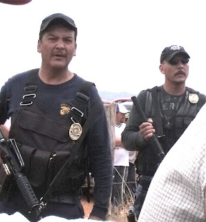 Suddenly a couple of police officers, armed with automatic weapons, barged their way into the group around the rig. I hadn’t seen them coming. There were no law enforcement officers around during the apparently very successful Barzón operative. Not having the law on their side – in the form of a permit – the Mennonites were largely compliant and seemed resigned.