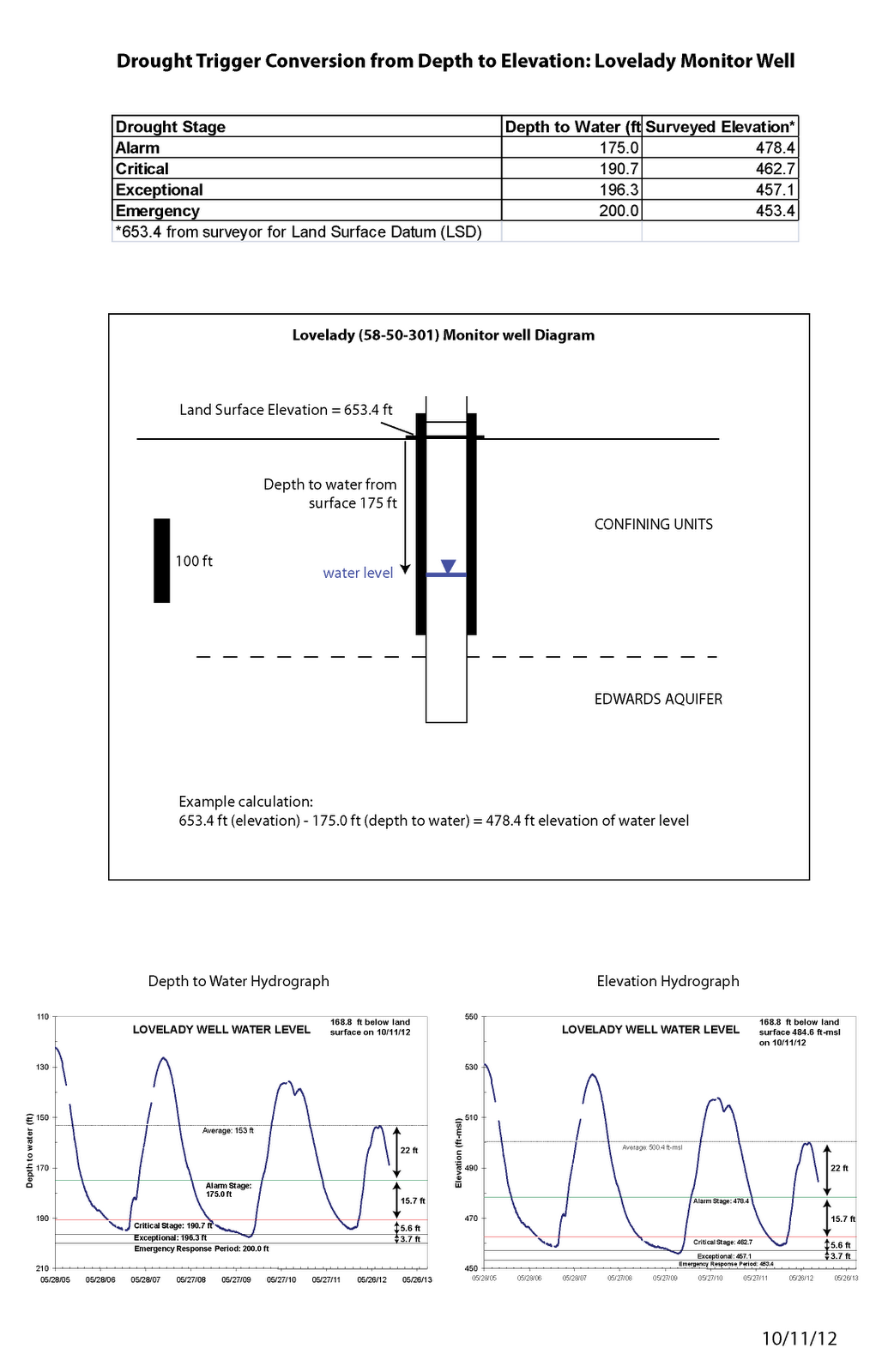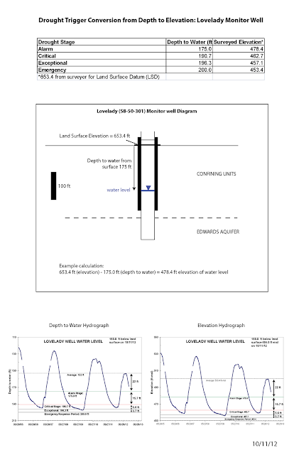 *The Board is on the verge of approving rules that would convert the drought thresholds for the Lovelady well from depth to water (in feet) to an elevation (feet above mean sea level). This is merely a conversion and does not influence the time or frequency of drought declarations from the established methodology.The image below is a summary of those conversions.