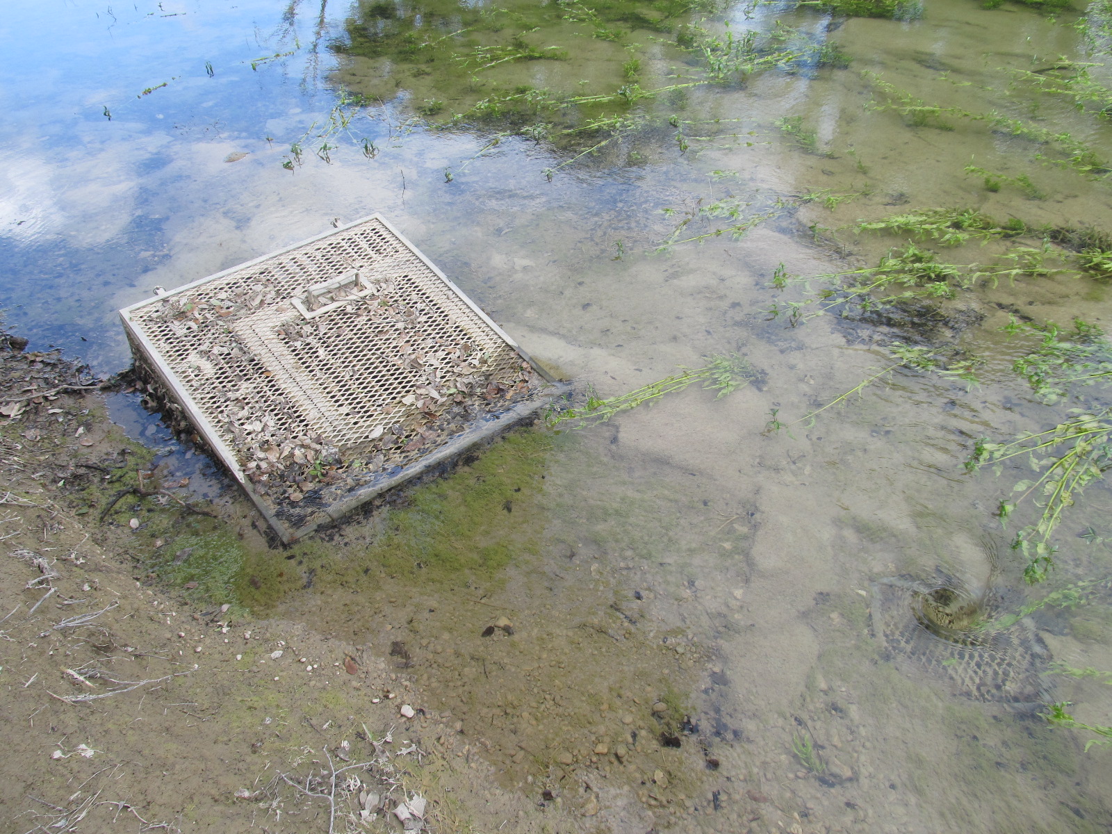Pictured here is a grate over Crippled Crawfish Cave in Onion Creek taken on 4/12/12. This cave and other small solution cavities in the creek are recharging all water that is flowing onto the recharge zone of the Edwards Aquifer, which is about 35 cubic feet per second. Note the small whirlpool in the lower right corner of the photo. Streamflow is diminishing quickly and soon recharge will cease altogether. Hopefully more rains will come this spring to continue the streamflow and recharge into features such as these.This feature, and others, are on lands owned and operated by the City of Austin for the sole purpose of water quality protection and restoration. A dye trace study in 2005 demonstrated flow from this feature to wells and Barton Springs. The dye arrived at Barton Springs is about 3 days at distance of about 18 miles!