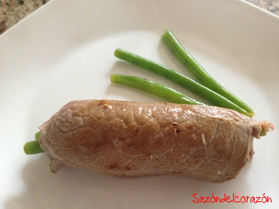 Delicioso rollo de carne relleno de ejotes con queso.
