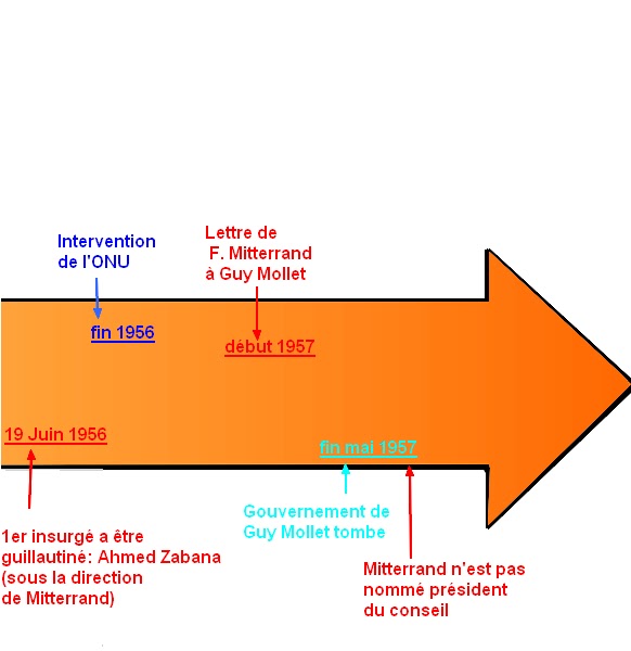 Les forces armées arrêtent et tuent tout les individus ayant le profil « d'un combattant indépendantiste ». Mitterrand qui n'avais pas encore vraiment réagis contre toute ces attaques meurtrières, décide d'utiliser la guillotine . Le premier insurgé que fit condamné par Mitterrand , était un combattant accusé d'avoir participé à une attaque, Ahmed Zabana, il fut exécuté le 19 juin 1956 . Par ces condamnations, le gouvernement espérait calmer l'Algérie et mettre fin au événements. Effectivement au début de la mise en place de la guillotine, les indépendantiste deviennent impuissant faces à elle.