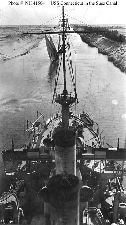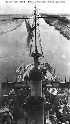 For those of you unfamiliar with it, Teddy Roosevelt sent the United States Navy on a round-the world cruise to display American power, the "big stick" part of his "speak softly and carry a big stick" policy. The cruise lasted from December 1907 to February 1909. It transited the Suez Canal in January 1909. Left, a photo from the Battleship USS Connecticut, from this US Navy site. To the best of my knowledge, the felucca in the picture was not a part of the Great White Fleet.