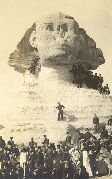 Below, sailors from the Great White Fleet pose at the sphinx.