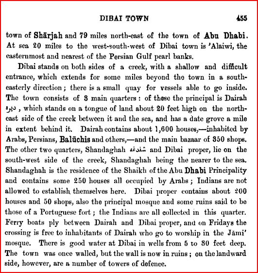 Just for the hell of it I thought I'd remind everyone that a century ago Dubai was a very different sort of place. I've talked about Lorimer's Gazetteer of the Persian Gulf before, and here's "Dibai Town" as he calls it, in Volume IIA, pp. 454-456 as it was around 1907: