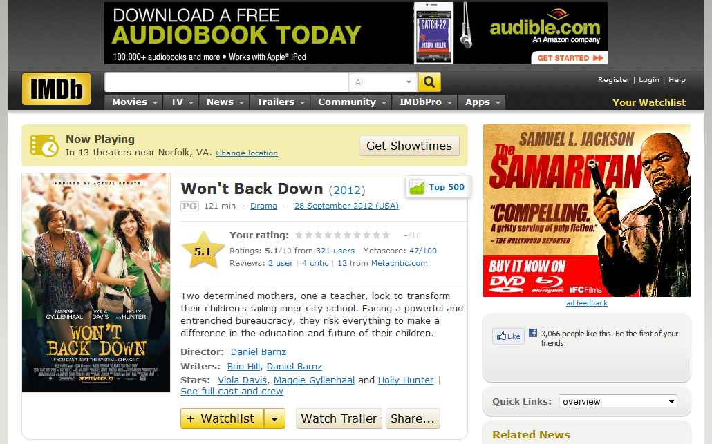 According to the currently observed IMDB site, Cowboys and Aliens was released in 2011 and Captain American was released in 2011, in keeping with our observed memento. However, the ad included on the IMDB memento promotes the movie "Won't Back Down." According to IMDB, this movie won't be released until 2012. Again, we can observed a memento with reference to present-day events.