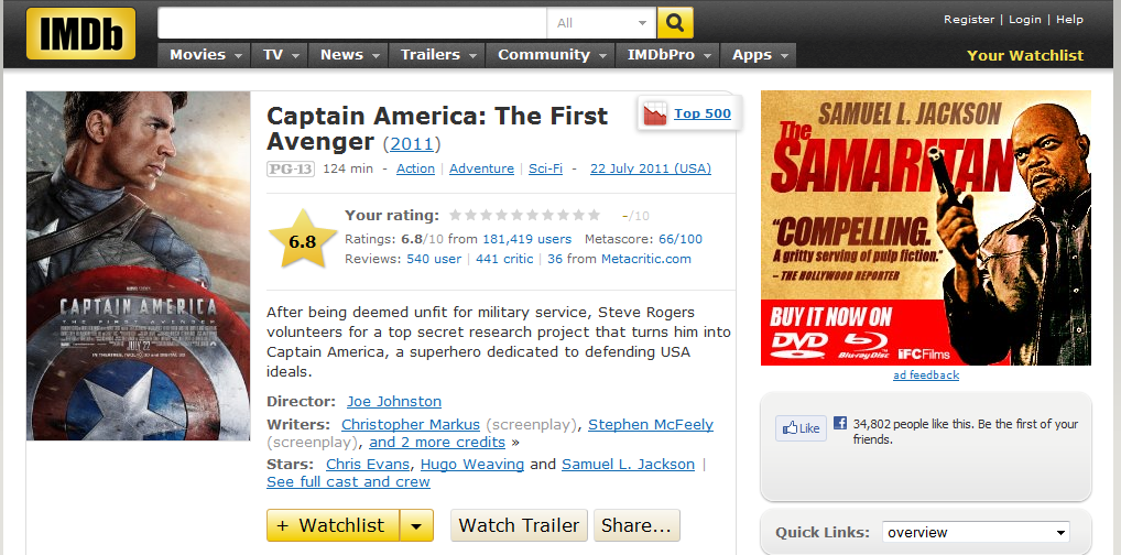 A second case study comes from the IMDB movie database site. We observed the July 28th, 2011 memento of the IMDB homepage at http://web.archive.org/web/20110728165802/http://www.imdb.com/. This memento advertises the movie Cowboys and Aliens. This movies is set to start "tomorrow" according to our observed July 28th, 2011 memento. Additionally, we see the current feature movie is Captain America.