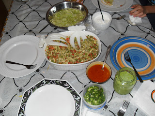 I didn't take a picture of the salad assembled on the tostada, because I forgot but here's the table set up, I like to spread some of the cream on the tostada, then top it with shredded lettuce and salsa
