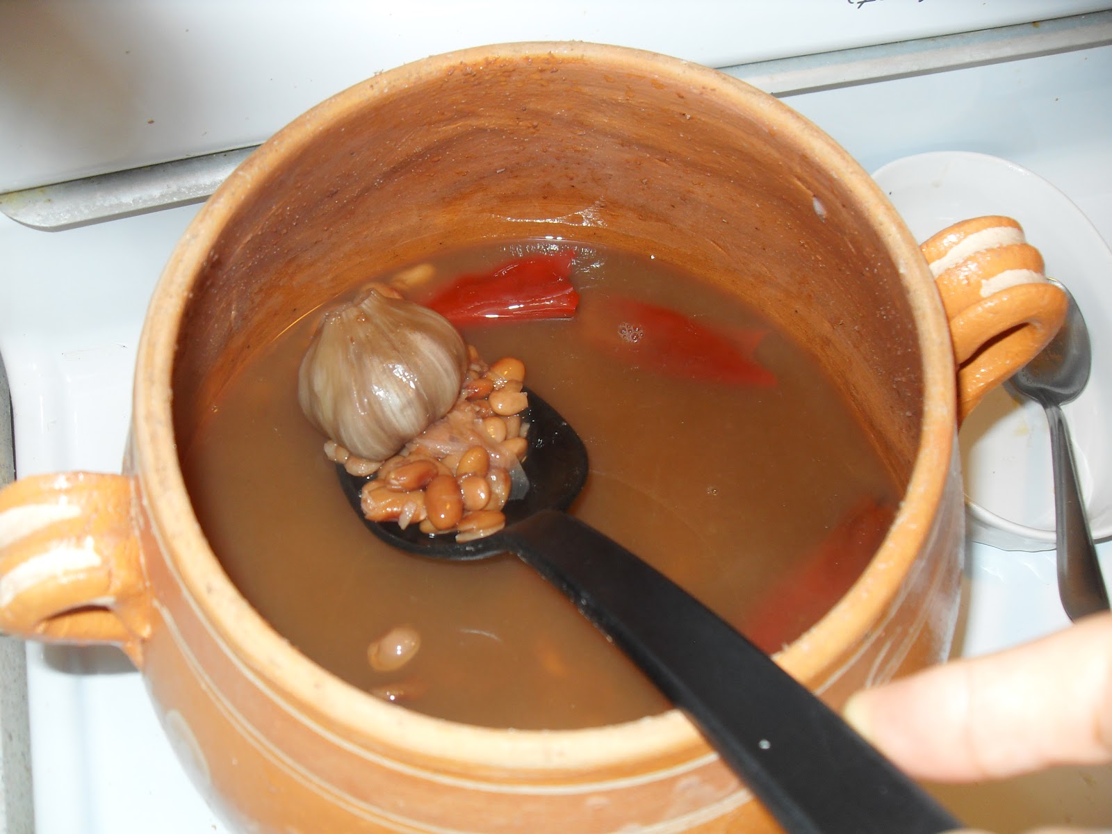 (2) My mother likes to throw away the garlic after it's boiled in there and the beans are done, but she blends the dried peppers and strains them back into the beans, it's her twist on my friends recipe and I love the taste it get's that way :)