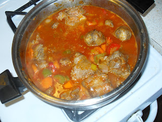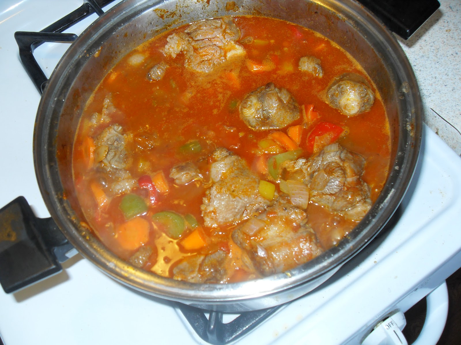 (2) This creates a wonderful "fond" for de-glazing on the bottom of the pan and will add a smokey, meaty flavor. Now lower your heat, remove oxtials and set aside, in the same pan add carrots, onions, bell eppers, and garlic cook down for 5- 8 minutes until translucent scraping the bottom of the pan with a wooden spoon.